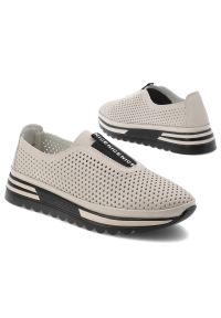 Beżowe Półbuty S.Barski Ażurowe Obuwie Damskie. Półbuty S.BARSKI - LR51-672 Beige to idealne połączenie nowoczesnego designu, komfortu i funkcjonalności, stworzone dla kobiet ceniących wygodę w modnym wydaniu. Perforowana cholewka wykonana z wysokiej jakości materiałów zapewnia doskonałą przewiewność, sprawiając, że półbuty S.BARSKI - LR51-672 Beige są idealnym wyborem na cieplejsze dni. Beżowa kolorystyka dodaje im subtelnej elegancji i sprawia, że łatwo dopasują się do wielu stylizacji – od casualowych po bardziej sportowe. Elastyczna podeszwa z kontrastującymi wstawkami gwarantuje stabilność oraz lekkość, a wsuwana konstrukcja ułatwia szybkie zakładanie lub zdejmowanie. Stylowy detal w postaci czarnej wstawki z napisem dodaje im charakteru i nowoczesnego wyglądu. Półbuty S.BARSKI - LR51-672 Beige to idealne obuwie dla kobiet, które szukają wygody, przewiewności i modnego wyglądu na co dzień.