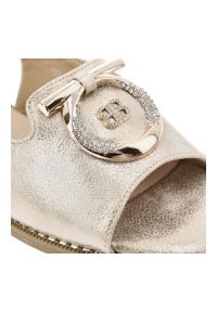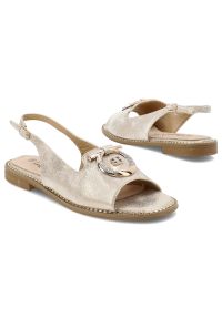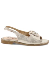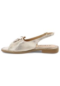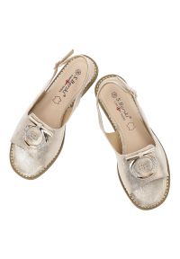 Złote Sandały S.Barski Stylowe Obuwie Damskie Zapinane Sprzączką. Sandały S.BARSKI - KV51-003 Lt.Gold to elegancka i wygodna propozycja na lato dla kobiet ceniących subtelny blask, a zarazem wyrafinowany styl. Cholewka w jasnym odcieniu złota pięknie odbija światło, dodając lekkości oraz szyku każdej stylizacji, natomiast ozdobna aplikacja z logo, kokardką czt połyskującymi cyrkoniami przyciąga uwagę, nadając butom biżuteryjnego charakteru. Regulowany pasek na pięcie zapewnia idealne dopasowanie, a miękka wkładka dba o komfort podczas codziennego noszenia. Delikatny obcas, jak również finezyjne wykończenia sprawiają, że sandały S.BARSKI - KV51-003 Lt.Gold sprawdzą się na co dzień lub podczas wyjątkowych okazji. To fason, który łączy kobiecość, modny wygląd i funkcjonalność w letnim wydaniu.