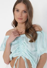 Jasnoniebieska Bluzka Aethenis. Bluzka Aethenis o fasonie hiszpanki, Modny, krótki fason z marszczeniami. Okrągły dekolt i dół bluzki z elastyczną gumką. Krótki, lekko bufiasty rękaw zakończony gumeczką. Z przodu, na środku wszyty sznurek, który możesz ściągnąć i zawiązać na dole, regulując w ten sposób długość. Oryginalna bluzka, która doskonale wyeksponuje ramiona oraz talię. Noś ją z jeansami lub ulubioną spódnicą z wysokim stanem.