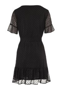 Czarna Sukienka Acalopei. Sukienka Acalopei z dekoltem w serek i krótkimi, szerokimi rękawami. Fason trapezowy, o długości mini. Z falbaną na dole i materiałowym, wiązanym paskiem na wysokości talii. Wykonana z tkaniny plumeti. Pod spodem dopasowana kolorystycznie, elastyczna podszewka. Minisukieinka Acalopei sprawdzi się w stylizacjach koktajlowych, romantycznych albo imprezowych.