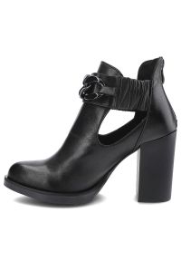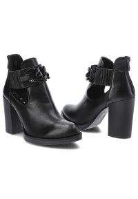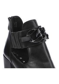 Czarne Botki Grace Damskie Modne Skórzane Buty. Botki GRACE - 10221 Czarny 1.214-0000/1 w kolorze głębokiej czerni to esencja nowoczesnej elegancji z nutą odwagi. Wyróżniają się efektownym wycięciem po bokach oraz szerokim paskiem ozdobionym lakierowanym łańcuchem, który dodaje im modowego charakteru. Wysoki, stabilny obcas słupkowy zapewnia smukłą sylwetkę, a także wygodę podczas codziennego użytkowania. Gładka faktura skóry ekologicznej czy też staranne wykonanie sprawiają, że botki GRACE - 10221 Czarny 1.214-0000/1 doskonale dopełnią stylizacje zarówno do pracy, jak i na wieczorne wyjścia. Model idealny dla kobiet ceniących klasykę w nowoczesnym wydaniu, które chcą się wyróżnić, a także zachować pełen komfort przez cały dzień.
