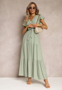 Zielona Sukienka Tantysus. Sukienka Tantysus o długości maxi. Letni fason z marszczoną gumką w pasie i wiązanym, materiałowym paskiem do kompletu. Z modnym, głębokim kopertowym dekoltem. Krótki rękaw w postaci falbanki. Zachowana w jednolitej kolorystyce, gładka. Gumka w pasie po rozciągnięciu mierzy: S - 77 cm, M - 82 cm, L - 85 cm, XL - 89 cm. Ta uniwersalna, letnia sukienka sprawi się idealni w codziennych stylizacjach.