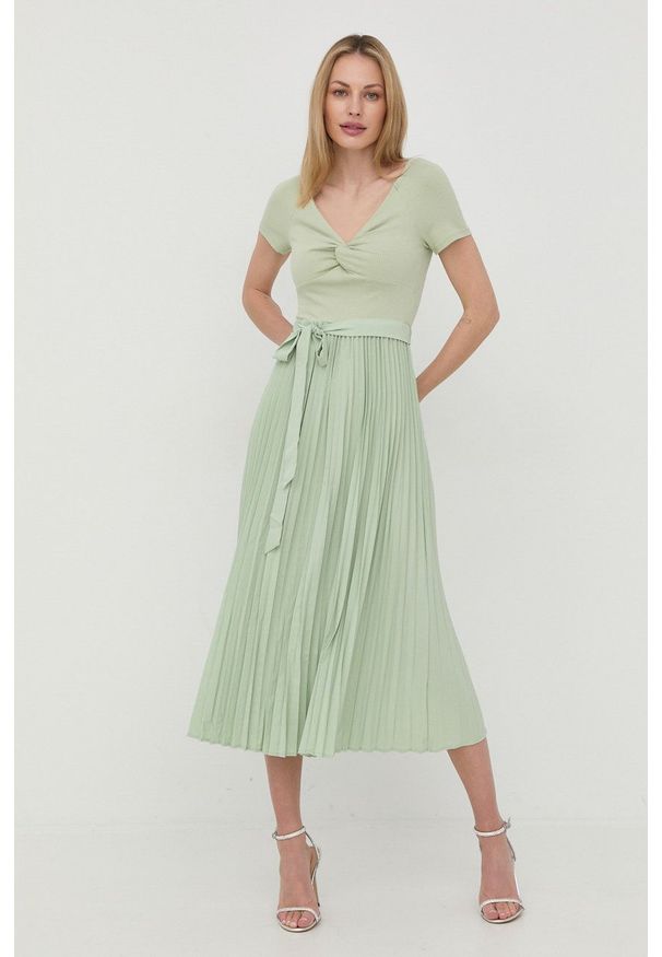 Guess sukienka kolor zielony midi rozkloszowana. - Produkt zawiera materiały z włókien pochodzących z recyklingu.- Dopasowana góra i rozkloszowany dół.- Krótki rękaw.- Spiczasty dekolt.- W talii pasek.- Materiał: połączenie dzianiny i tkaniny.- Plisowany model.- Szerokość pod pachami: 36 cm.- Długość: 126 cm.- Wymiary podane dla rozmiaru: S.