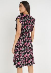 Czarno-Różowa Sukienka z Wiskozy Actamia. Sukienka Actamia o rozkloszowanym fasonie, długość mini. W pasie cienki sznurek, przeprowadzony przez tunel, który możesz przewiązać na kokardkę. Góra z trójkątnym dekoltem. Przy dekolcie ozdobne guziki. Przy ramionach, aż do linii tali, a także na dole fasonu doszyte zwiewne falbanki. Bez podszewki. Wykonana z wiskozy, pokryta wzorem w kwiaty. Casualowa, krótka sukienka to świetny wybór do codziennych stylizacji.