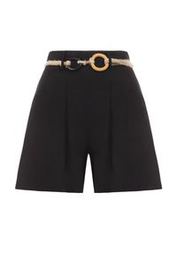 Czarne Bawełniane Szorty z Paskiem Typhitheme. Szorty Typhitheme high waist. Elegancki fason z zakładkami. Do szortów dołączony pasek ze sznurka z okrągłymi klamrami z drewna. Luźna nogawka sięga mniej więcej do kolana. Z tyłu w pasie wszyta gumka, ze szlufkami. Posiadają wsuwane kieszenie po bokach na wysokości bioder. Wykonane z gładkiej bawełny. Eleganckie szorty na lato będą doskonale pasować do sandałów na obcasie i koszuli.