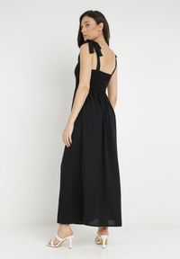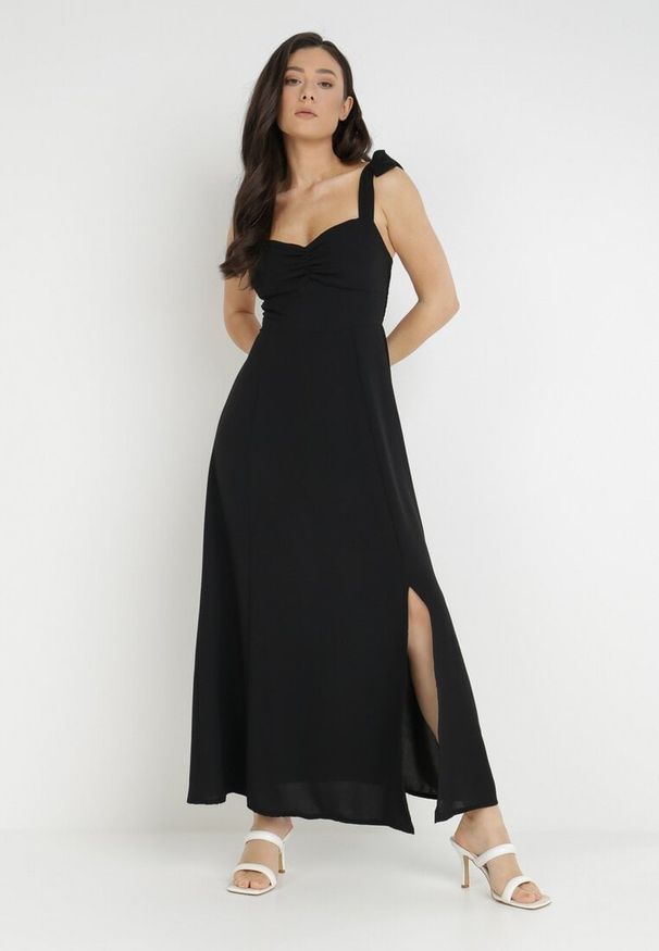 Czarna Rozkloszowana Sukienka na Wiązanych Ramiączkach z Rozcięciem Kalora. Sukienka Kalora maxi, o rozkloszowanym fasonie. Model na wiązanych, szerokich ramiączkach. Dekolt trójkątny, z pionowym przeszyciem tworzącym marszczenia. Na plecach elastyczny ściągacz. Z głębokim wycięciem na dole. Jednokolorowa, wykonana z tkaniny o gładkim wzorze. Bez podszewki. Łącz ją z sandałami na słupku albo szpilce.