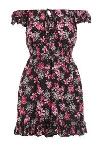 Czarny Kombinezon z Wiskozy Fimo. Kombinezon Fimo z krótką, luźną nogawką, na wzór spódnicy z falbanką na dole. Łódkowy dekolt z wiązaniem na środku. Przy dekolcie wszyta elastyczna gumka, dzięki której możesz go nosić odsłaniając obojczyki. Z bardzo krótkim rękawem. W pasie gumki, które podkreślą talię. Zdobiony wzorem w urocze kwiatki. Wykonany z wiskozy. Letni kombinezon Fimo zastąpi sukienkę mini, a Ty z pewnością zaprezentujesz się w nim olśniewająco.