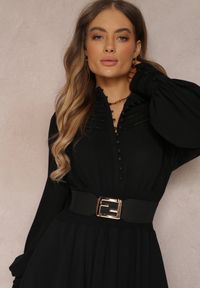 Czarna Sukienka Elothoe. Sukienka Elothoe w stylu vintage. Długość maxi z zabudowany dekolt typu stójka z koronkowymi lamówkami. Góra zapinana na powlekane guziki. Długie rękawy z koronkowym, długim mankietem z trzema guzikami. Sukienka posiada podszewkę, w pasie wszyte cienkie gumeczki, które jeszcze lepiej podkreślą wcięcie w talii. Gumka w pasie po rozciągnięciu mierzy: S/M 91, M/L 97 cm. Idealna na romantyczną randkę!