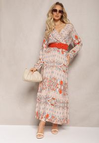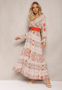 Jasnobeżowa Sukienka Rozkloszowana z Paskiem Shara. Sukienka Shara z długim, luźnym rękawem zakończonym ściągaczem. Dekolt głęboki, kopertowy. Sukienka z gumką w talii, po rozciągnięciu mierzy S-90 cm, M-93 cm, L-97 cm, XL-101 cm. Model maxi, bez podszewki. W pasie dodatkowo pasek z materiału oraz z klamrą. Na dole falbana. Sukienka uszyta z tkaniny we wzór floral. Styl boho kochają influencerki z całego świata - wybierz ten model na romantyczny wieczór, spacer po molo lub plaży lub wyjście z przyjaciółmi!