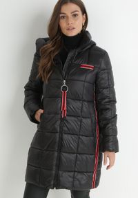 Czarna Kurtka Pikowana z Lampasami i Kapturem Hina. Kurtka Hina pikowana, sięgająca za kolano. Z przodu wygodnie zasuwana na zamek błyskawiczny. Dekorowana po bokach stylowymi lampasami. Model wyposażony w niedopinany kaptur. Na wysokości pasa funkcjonalne, zapinane kieszenie. Średnio ocieplana - idealnie sprawdzi się w sezonie zimowym. Koniecznie dopasuj ją z kozakami na koturnie lub workerami!