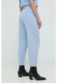 Bruuns Bazaar spodnie damskie kolor niebieski proste high waist. - Ten produkt został częściowo uszyty z poliestru pochodzącego z recyklingu.- Produkt częściowo wykonany z LENZING™ ECOVERO™ - materiału przyjaznego środowisku. Produkcja LENZING™ ECOVERO™ z ekologicznej celulozy i pulpy drzewnej wykorzystuje o 50% mniej wody w porównaniu do popularnej wiskozy.- Zwężana nogawka.- Wsuwane kieszenie.- Podwyższony stan.- Zapięcie na suwak, guzik i haftkę.- Nogawka zaprasowana w kantkę.- Szerokość nogawki: 31 cm.- Wysokość stanu: 31 cm.- Długość nogawki: 99 cm.- Szerokość nogawki na dole: 16 cm.- Szerokość w biodrach: 55 cm.- Szerokość w pasie: 35 cm.- Wymiary podane dla rozmiaru: 36.