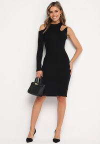 Czarna Sukienka z Prążkowanej Dzianiny i Wycięciami Hibba. Sukienka Hibba midi, o dopasowanym fasonie, wykonana z prążkowanej dzianiny. Z jednym długim rękawem, z drugiej strony ramiączko z łańcuszka. Dekorowana stylowymi wycięciami. Bez podszewki.