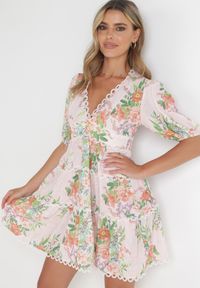 Born2be - Jasnoróżowa Rozkloszowana Sukienka Mini w Kwiaty z Koronką przy Dekolcie i Falbanką Daninia. Kolor: różowy. Materiał: koronka. Długość rękawa: krótki rękaw. Wzór: koronka, kwiaty. Długość: mini
