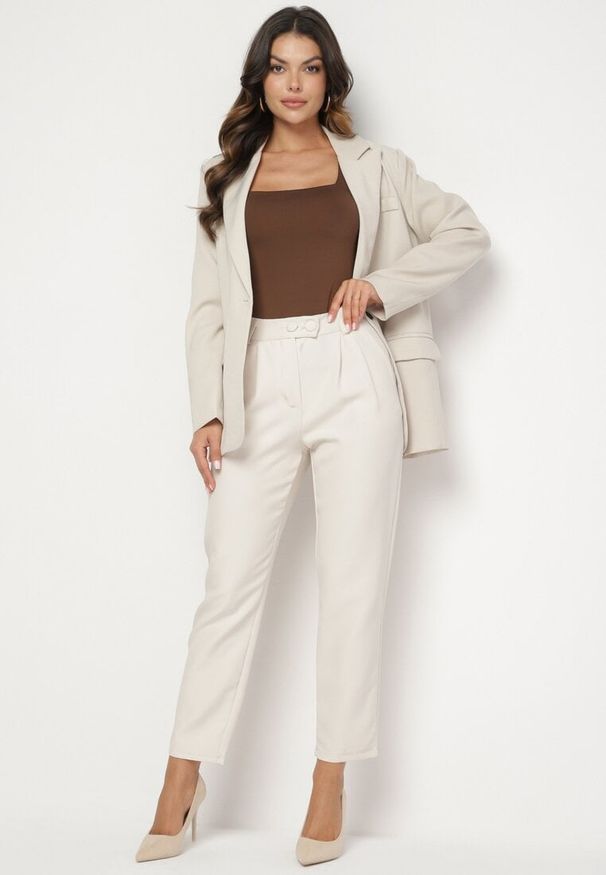 Jasnobeżowe Spodnie Cygaretki z Wysokim Stanem i Gumką w Pasie Elexis. Spodnie cygaretki z wysokim stanem. Wykonane z miękkiej dzianiny. Na wysokości bioder wsuwane kieszenie. Zapinane na dwa guziki i suwak, z tyłu w pasie wszyta gumka. Idealne na co dzień.