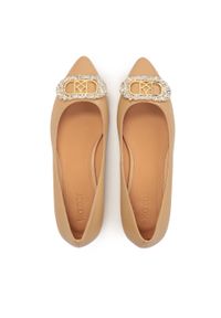 Skórzane czółenka na płaskim obcasie. Czółenka na płaskim obcasie ze złotą, metalową wstawką to komfortowa propozycja dla kobiet ceniących wygodę i elegancki wygląd. Cholewka ze spiczastym noskiem wykonana jest z gładkiej skóry licowej w beżowym kolorze. Obuwie zdobią duże broszki z połyskującymi kryształami i monogramem KAZAR. Prezentowane czółenka doskonale sprawdzą się jako ozdoba klasycznych, wieczorowych oraz okazjonalnych stylizacji. &