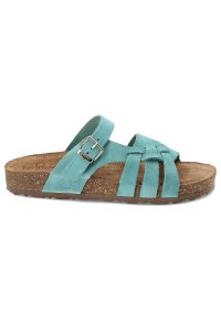 Niebieskie Klapki Yokono Wygodne Skórzane Buty. Niebieskie klapki YOKONO - Jerba-090 Nob Aqua(Clorofila) to pożądane obuwie, dostępne w wyrazistym, morskim kolorze. Cieszącą się popytem cholewkę sprawiono z nubuku. Dobrze wyprofilowana wkładka opóźnia zmęczenie stóp, dzięki czemu sprawdza się podczas całodziennego pobytu poza domem. Wkładka i wnętrze ze skóry naturalnej pozwolą Ci zapomnieć o uciążliwym bólu. Damskie klapki YOKONO - Jerba-090 Nob Aqua(Clorofila) <span sty