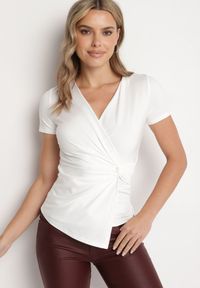 Born2be - Biała Bluzka z Kopertowym Dekoltem i Ozdobnym Węzłem Jazel. Kolor: biały. Sezon: wiosna, lato