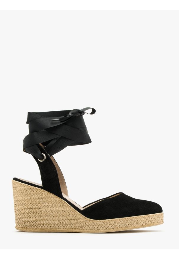 Dwuczęściowe czółenka z wiązaniem wokół kostki STELLA. Dwuczęściowe czółenka w kolorze czarnym z linii RYŁKO RELAX. Model wykonany z weluru. Podszewka i wyściółka skórzana. Klin + platforma o wysokości 8,5 cm. Nosek okrągły. W tym modelu obuwia pod wyściółką znajduje się pianka amortyzująca z węglem aktywnym. Nadaje to jej właściwości silnie antybakteryjne i przeciwgrzybicze. Pianka jest perforowana, dzięki czemu zapewnia cyrkulację powietrza oraz pochłania nadmiar wilgoci. Pianka jest miękka i dopasowuje się do stopy. Właściwości te znacząco podnoszą komfort użytkowania obuwia.