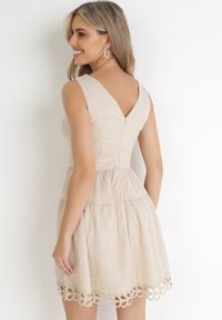 Born2be - Beżowa Taliowana Sukienka Mini z Ozdobną Koronką Veronisa. Okazja: na co dzień, na spacer. Kolor: beżowy. Materiał: koronka. Wzór: koronka. Styl: casual, wakacyjny. Długość: mini #3