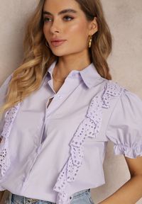 Fioletowa Koszula z Ozdobnymi Rękawami i Falbankami z Przodu Johna. Chcesz wyróżnić swoją stylizację? Postaw na wyjątkową koszulę Johna! Z przodu ozdobiona jest haftowanymi falbankami. Model z krótkimi rękawami, kołnierzykiem i guzikami. Idealna na wiosnę i lato.