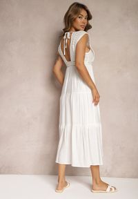 Biała Szydełkowa Sukienka Maxi z Głębokim Dekoltem i Falbanką na Dole Annama. Sukienka Annama z szydełkową górą i głębokim dekoltem. Model o długości maxi, bez rękawów. W środku podszewka. Dół zakończony falbanką. Świetnie sprawdzi się w do sandałów na koturnie czy słupku.