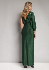 Born2be - Zielona Błyszcząca Asymetryczna Sukienka Maxi z Rozcięciem i Kopertowym Dekoltem Aknasa. Kolor: zielony. Materiał: materiał. Typ sukienki: kopertowe, asymetryczne. Długość: maxi