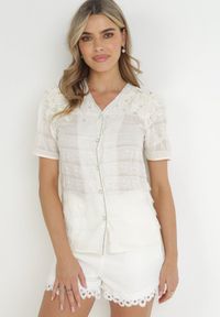 Renee - Beżowa Koszula z Bawełny Ozdobiona Ażurowym Wzorem Natalena. Okazja: na co dzień. Kolor: beżowy. Materiał: bawełna. Długość rękawa: krótki rękaw. Długość: krótkie. Wzór: aplikacja, ażurowy. Styl: casual