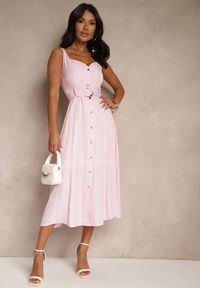 Born2be - Różowa Rozkloszowana Sukienka Midi na Cienkich Ramiączkach z Wiązaniem w Talii Tessonne. Kolor: różowy. Długość rękawa: na ramiączkach. Długość: midi