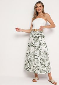 Biało-Zielona Wiskozowa Spódnica Maxi z Gumką w Pasie i Paskiem z Plecionki Dayo. Rozkloszowana spódnica Dayo z gumką w pasie. Dół zdobiony falbankami. Wykonana z wiskozy. Dodatkowo pleciony pasek z klamerką. Idealna na wiosnę i lato.