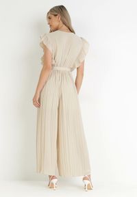 Beżowy Plisowany Kombinezon z Szerokimi Nogawkami i Wiązanym Paskiem Audra. Odkryj elegancję z nutą nonszalancji z kombinezonem Audra, który łączy w sobie ponadczasową klasykę z najnowszymi trendami. Plisowany fason z szerokimi nogawkami i delikatnymi falbankami przy rękawach podkreśli Twoją sylwetkę, a kopertowy dekolt doda całości zmysłowości. Idealny na różne okazje – zestaw go z sandałami na obcasie i torebką na ramię na wieczorne wyjście lub postaw na sneakersy i shopperkę na co dzień. Wyposażony w gumkę w talii i pasek, będzie idealnym wyborem na wiosenne i letnie dni, gdy chcesz czuć się komfortowo i stylowo w każdej sytuacji! Kombinezon posiada podszewkę.