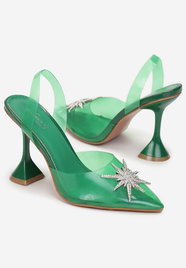 Born2be - Zielone Sandały na Szpilce Ozdobione Drobnymi Cyrkoniami Nolsara. Kolor: zielony. Wzór: aplikacja. Obcas: na szpilce