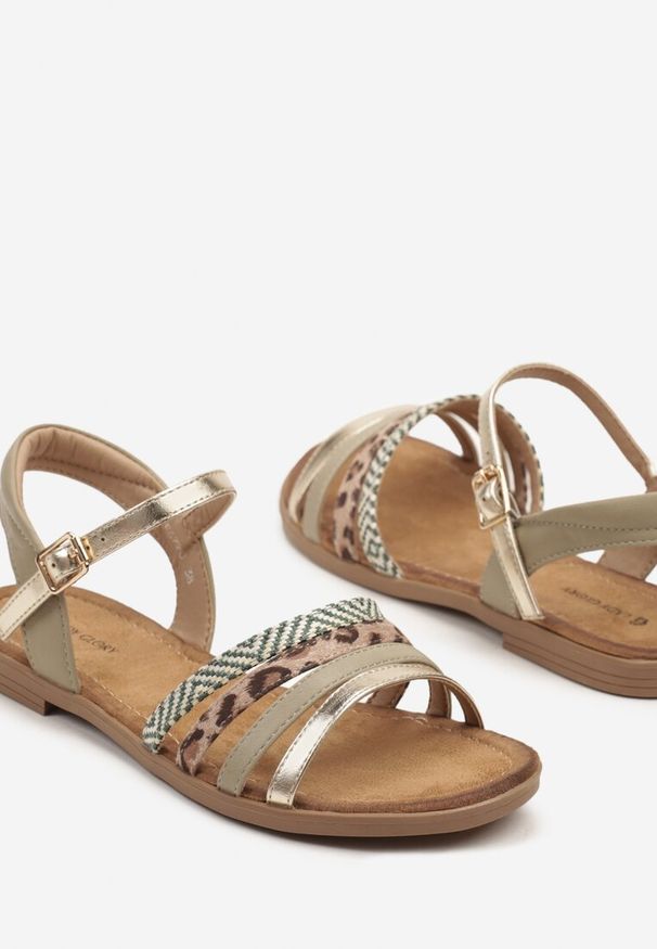 Renee - Złote Sandały w Panterkę na Plecionym Koturnie z Ozdobnymi Paskami Tananira. Okazja: na co dzień, na spacer, na imprezę. Zapięcie: pasek. Kolor: złoty. Wzór: motyw zwierzęcy. Sezon: lato. Obcas: na koturnie. Styl: wizytowy, casual