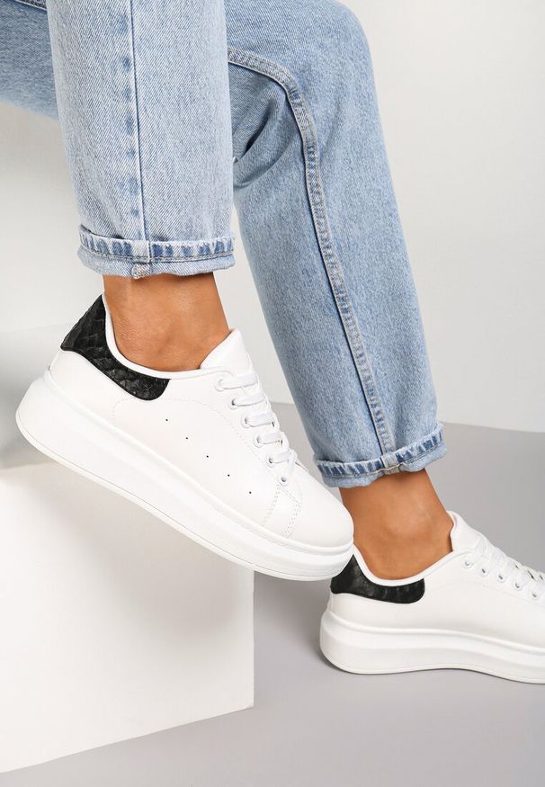 Renee - Białe Sneakersy Zdobione Wstawkami z Imitacji Skóry Fayela. Kolor: biały. Materiał: skóra. Wzór: aplikacja