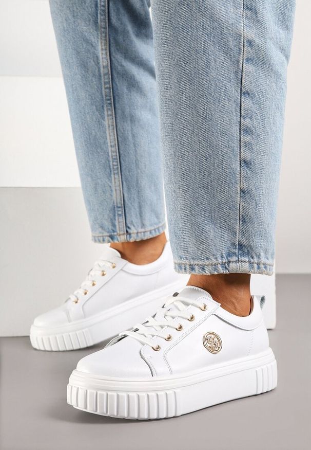 Born2be - Białe Skórzane Sneakersy na Grubej Podeszwie z Metaliczną Wstawką Remalia. Okazja: na co dzień. Kolor: biały. Materiał: skóra