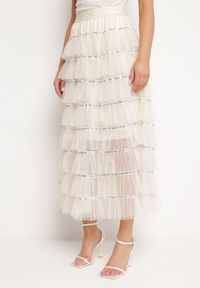 Born2be - Biała Spódnica Maxi o Rozkloszowanym Fasonie Ozdobiona Falbankami i Cekinami Meepa. Kolor: biały. Materiał: materiał. Wzór: aplikacja