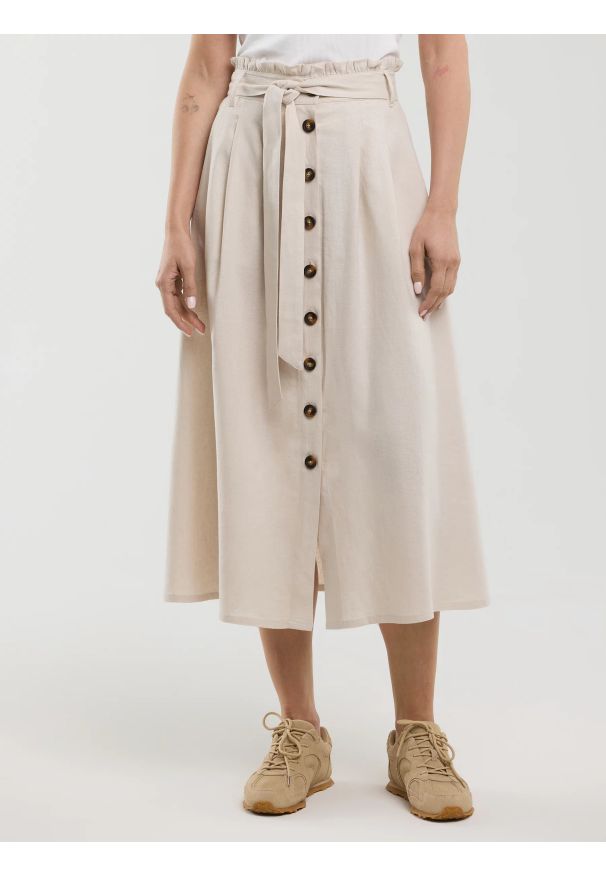 Big-Star - Spódnica damska midi lniana z ozdobnymi guzikami beżowa Cosmo 800. Okazja: na co dzień. Kolor: beżowy. Materiał: len. Sezon: lato. Styl: casual, elegancki