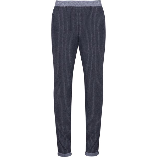 Spodnie Deha w subtelne srebrne prążki. Pas wykończony połyskującymi dżetami. Po bokach dwie kieszenie. Tkanina elastyczna, odporna na zagniecenia.