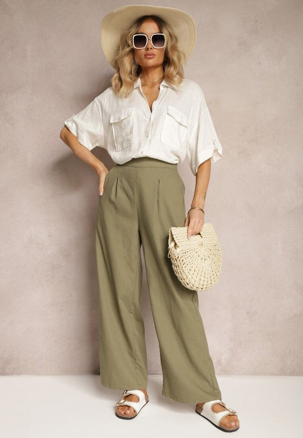 Renee - Zielone Casualowe Spodnie z Lnem z Gumką w Pasie Filanisse. Okazja: na co dzień. Kolor: zielony. Materiał: len. Styl: casual