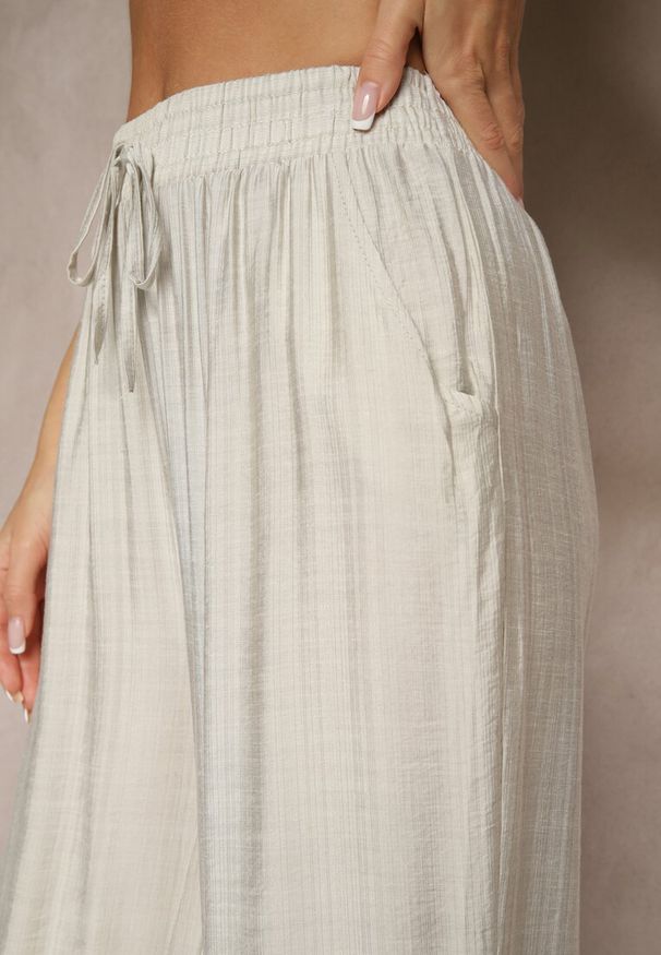 Renee - Beżowe Spodnie High Waist ze Sznurkiem w Talii i Prostą Nogawką Raveann. Okazja: na co dzień, na spacer. Stan: podwyższony. Kolor: beżowy. Wzór: aplikacja. Styl: casual