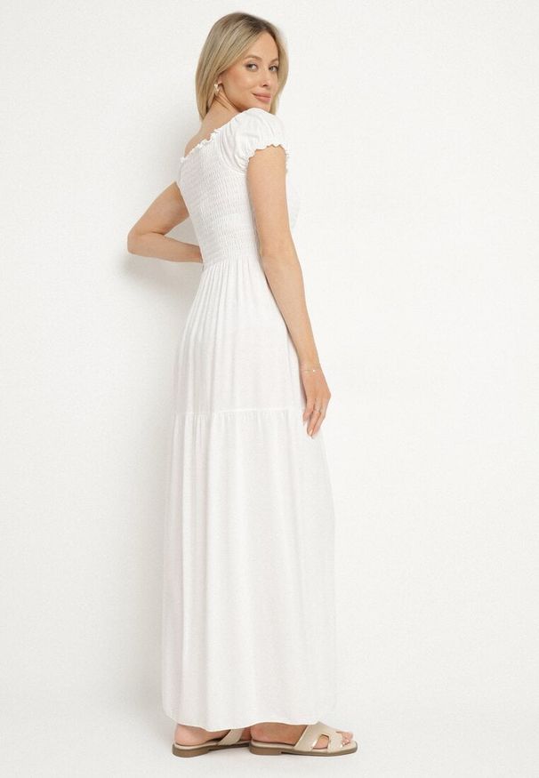 Born2be - Biała Sukienka Hiszpanka z Ornamentalnym Wzorem z Wiskozą Orrionna. Okazja: na spacer, na imprezę. Typ kołnierza: dekolt hiszpanka. Kolor: biały. Materiał: wiskoza. Sezon: lato. Styl: klasyczny. Długość: maxi