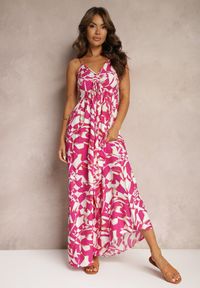 Renee - Różowa Sukienka Bawełniana z Gumką w Talii i Ornamentalnym Printem Natilessae. Okazja: na co dzień. Kolor: różowy. Materiał: bawełna. Wzór: nadruk. Styl: casual, elegancki