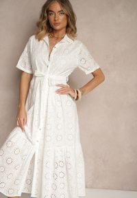 Renee - Biała Koszulowa Sukienka Midi z Ażurowym Zdobieniem Tatrasi. Kolor: biały. Materiał: koronka, materiał. Długość rękawa: krótki rękaw. Wzór: aplikacja, ażurowy. Typ sukienki: koszulowe. Długość: midi