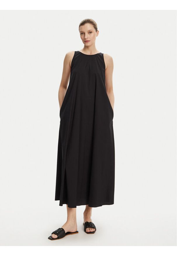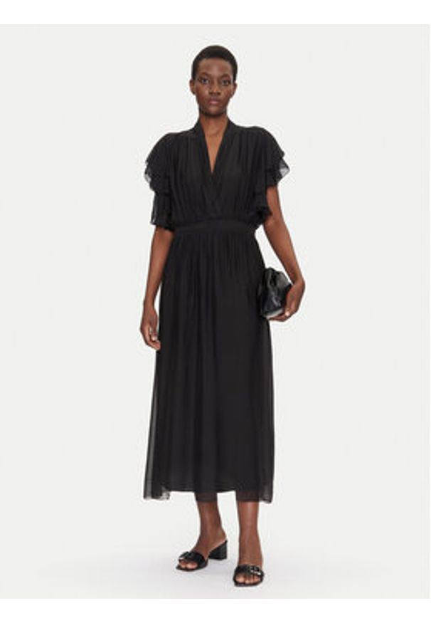 Renee - Czarna Sukienka z Wiskozy Apostelis. Kolor: czarny. Materiał: wiskoza. Sezon: lato. Typ sukienki: rozkloszowane. Styl: klasyczny. Długość: midi
