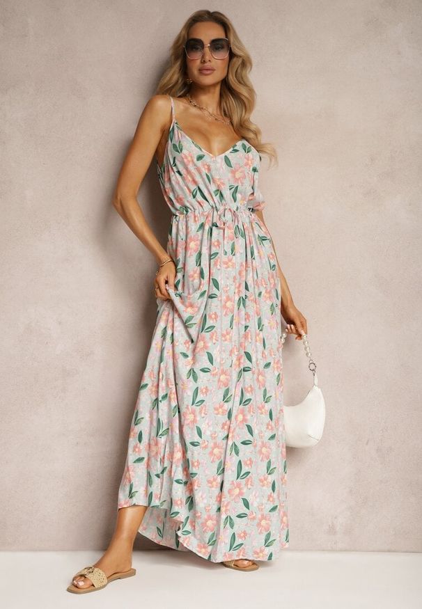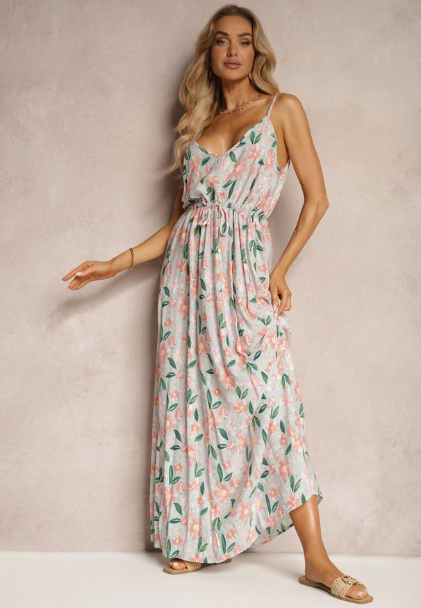 Renee - Zielona Sukienka a Kwiatowa Sukienka Zdobiona Wiązaniem z Tyłu i Gumką w Pasie Rivattia. Okazja: na co dzień. Kolor: zielony. Materiał: bawełna. Wzór: aplikacja, kwiaty. Sezon: lato. Styl: casual, wakacyjny, elegancki
