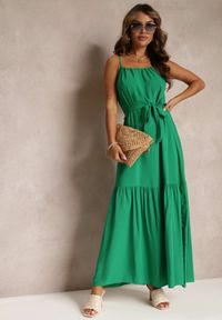 Born2be - Zielona Wiskozowa Sukienka na Regulowanych Ramiączkach z Wiązaniem przy Dekolcie Srinesa. Okazja: na co dzień. Kolor: zielony. Materiał: wiskoza. Długość rękawa: na ramiączkach. Sezon: wiosna, lato. Typ sukienki: proste. Styl: casual, elegancki