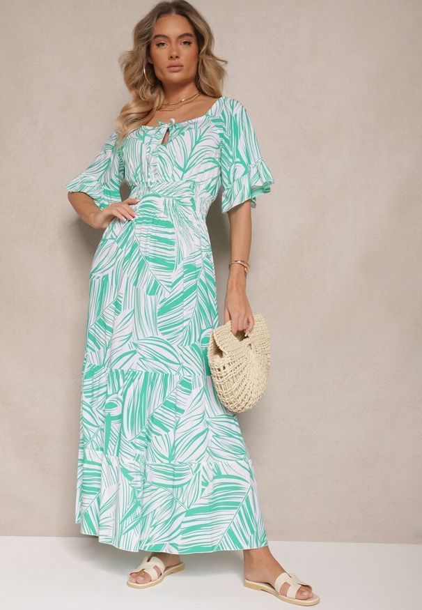 Born2be - Zielona Wiskozowa Sukienka Maxi z Gumką w Pasie i Ozdobnym Dekoltem Nashira. Kolor: zielony. Materiał: wiskoza. Sezon: wiosna, lato. Długość: maxi