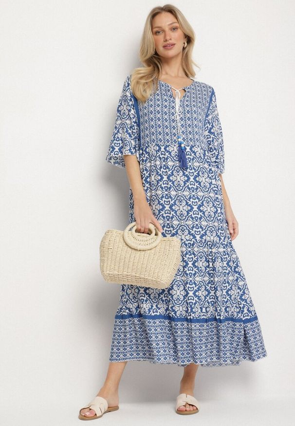 Born2be - Ciemnobeżowa Sukienka Wiskozowa Rozkloszowana z Odkrytymi Plecami w Print Boho Turaisa. Okazja: na co dzień. Typ kołnierza: dekolt w kształcie V. Kolor: beżowy. Materiał: wiskoza. Długość rękawa: długi rękaw. Wzór: nadruk. Typ sukienki: rozkloszowane, proste. Styl: boho