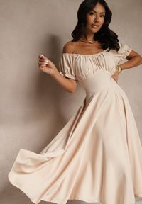 Renee - Beżowa Dopasowana Sukienka Zdobiona Marszczeniem i Wycięciem w Pasie Desariel. Okazja: na co dzień. Kolor: beżowy. Długość rękawa: krótki rękaw. Wzór: aplikacja. Sezon: wiosna, lato. Styl: klasyczny, casual