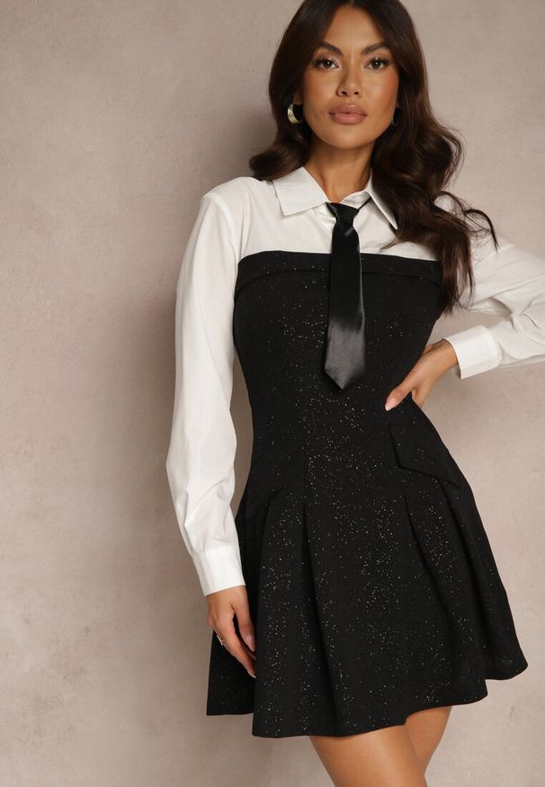 Renee - Czarno-Biała Koszulowa Sukienka Mini o Rozkloszowanym Kroju z Paskiem Launge. Kolor: czarny. Materiał: tkanina. Wzór: geometria, gładki, nadruk. Typ sukienki: koszulowe. Długość: mini