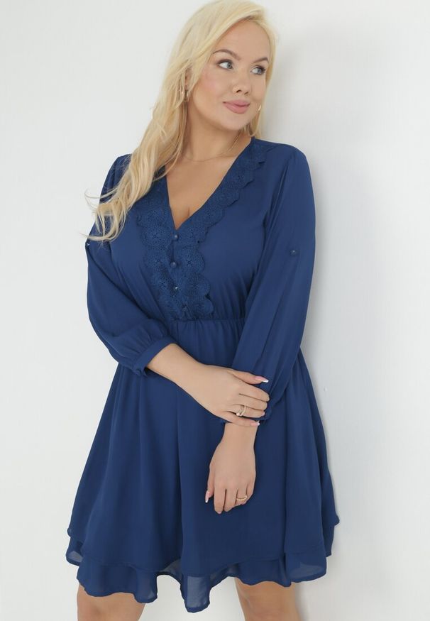 Born2be - Biała Sukienka z Koronką i Guzikami przy Dekolcie Thompson. Kolor: biały. Materiał: koronka. Wzór: koronka